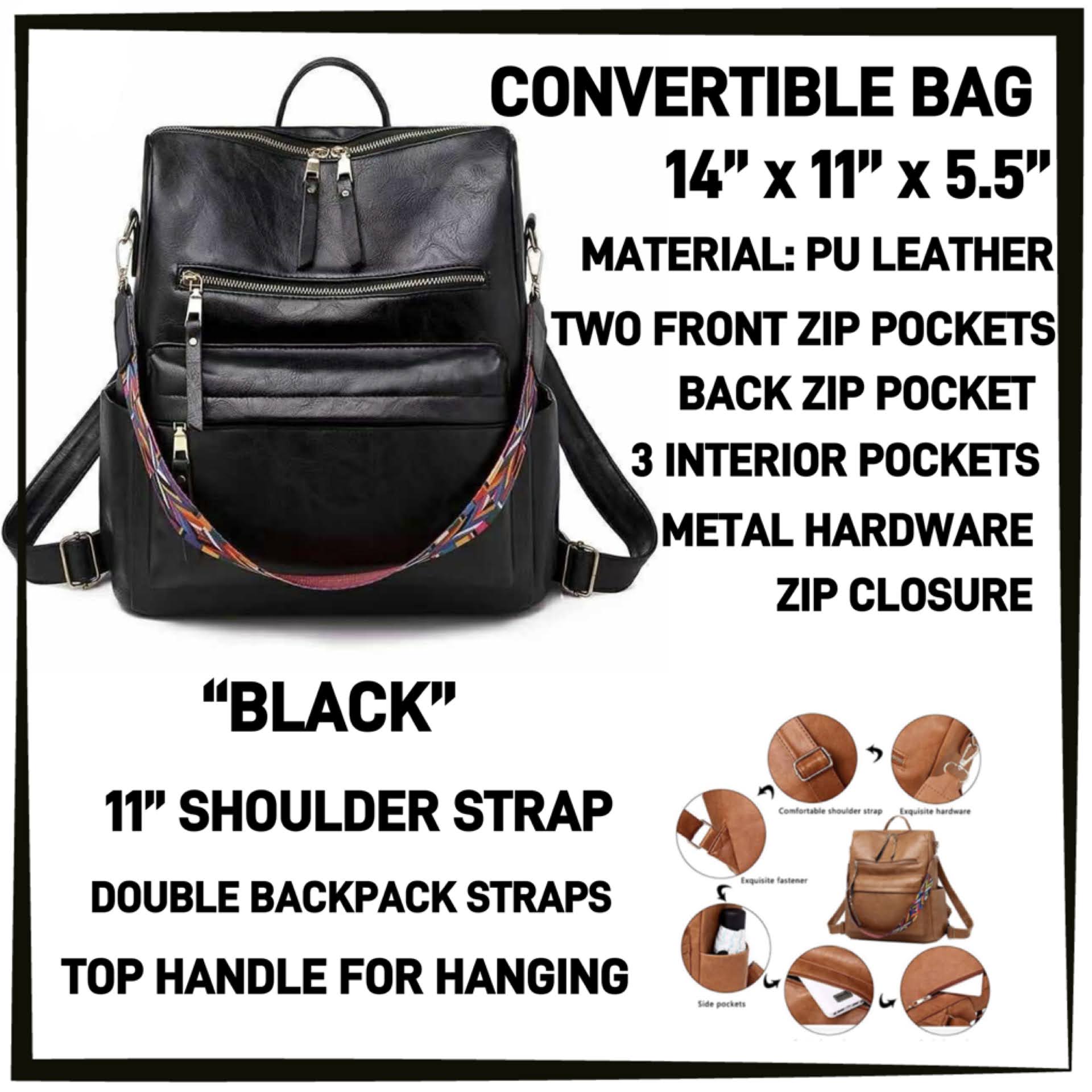 The Convertible Bag offers a perfect blend of practicality and style in a sleek 14"x11"x5.5" design. Made from premium PU leather, it features two front zip pockets, a back zip pocket, and three interior compartments to keep your belongings organized. Equipped with durable metal hardware and a secure zip closure, it ensures your items stay safe. Carry it your way with an 11" shoulder strap, double backpack straps, or a convenient top handle for hanging. This versatile bag adapts seamlessly to your lifestyle, making it an essential everyday companion.