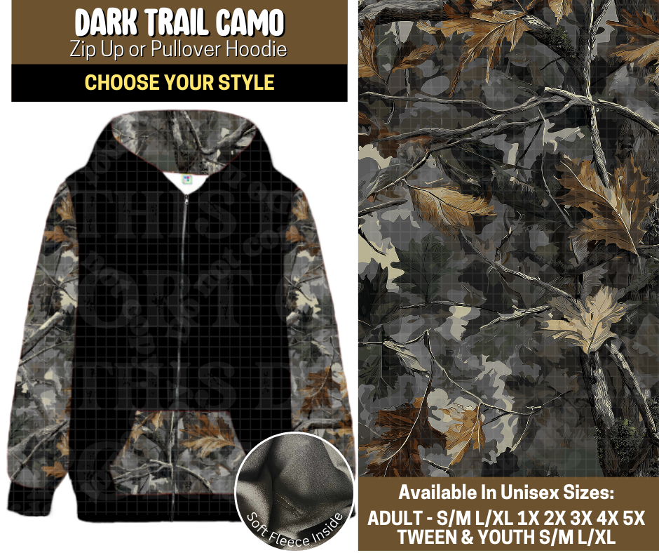 Preorder! Closes 9/12. ETA Dec. Dark Trail Camo Zip-Up or Pullover Hoodie