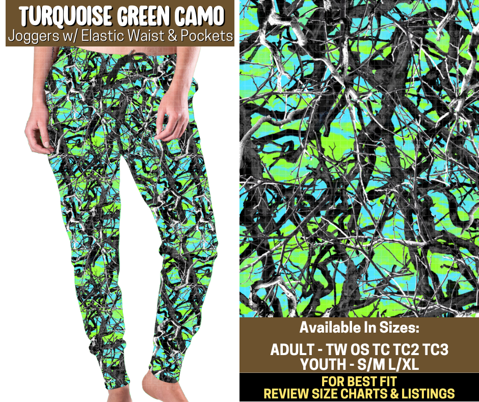 Preorder! Closes 9/12. ETA Dec. Turquoise Green Camo Joggers